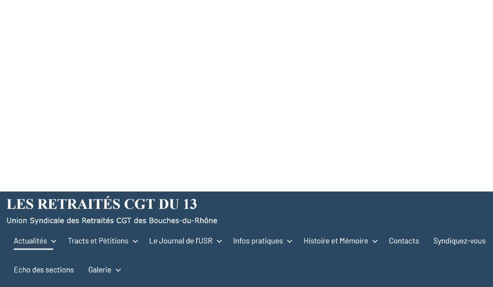 Vous y trouverez les dernières actualités de la CGT retraités et aussi toutes les informations émanant de la Confédération, de l'UCR et de l'UD CGT 13.